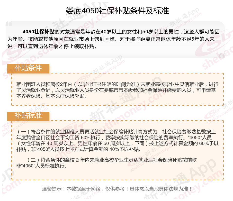 娄底4050社保补贴多少钱一个月?娄底4050社保补贴2025年最新标准是多少?2025娄底4050补贴主要针对的是年龄在40岁以上的女性和50岁以上的男性,这些人群通常因为年龄较大而面临就业困难。