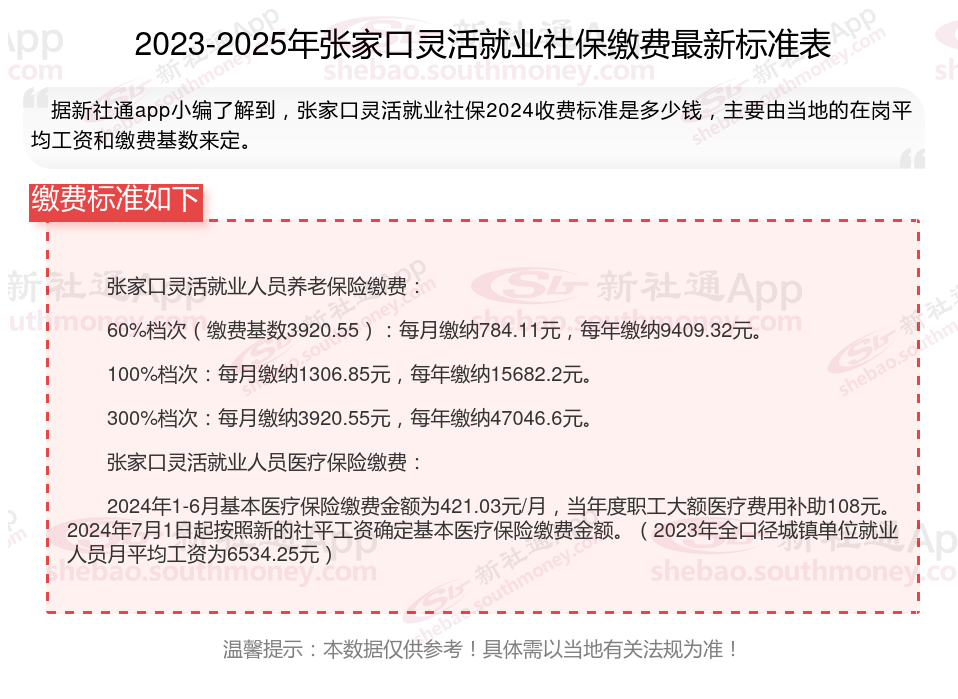 以上就是带来张家口灵活就业社保缴费标准相关知识,内容供参考,希望对你有帮助,欢迎关注/下载新社通APP解锁更多社保专业资讯。