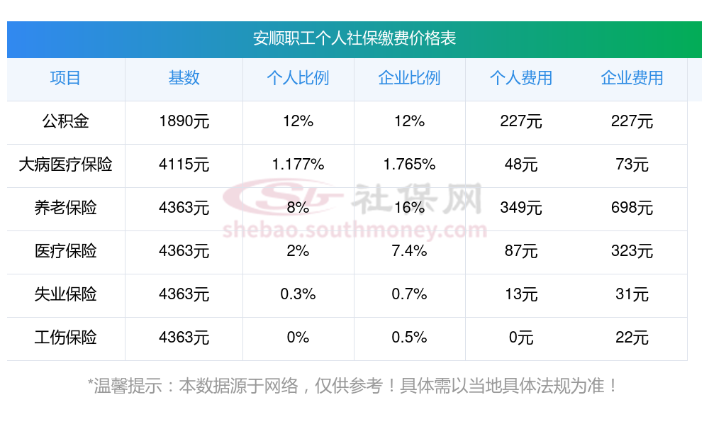 2025年安顺社保缴费多少钱?下表是2024-2025年安顺社保费用明细参考,新社通app-社保缴费查询工具提供的最新数据如下: