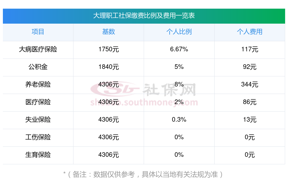 2025年大理社保缴费多少钱?大理社保公积金缴费基数为:3579.00元,个人比例 : 0.08,下表是2025大理社保费用明细参考,新社通app-社保缴费查询工具提供的最新数据如下: