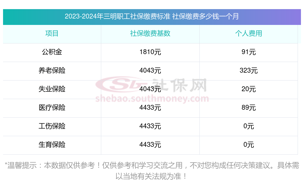 2025年三明社保缴费多少钱?下表是2024-2025年三明社保费用明细参考,新社通app-社保缴费查询工具提供的最新数据如下: