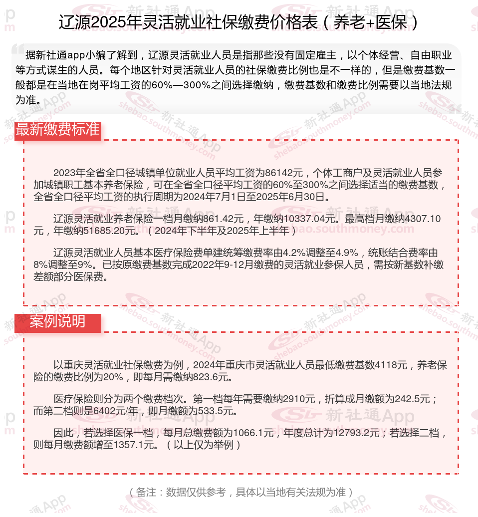 辽源灵活就业社保交多少钱一个月?2025社保缴费标准详情,根据新社通app-社保缴费查询工具提供的2025社保缴费标准详情数据如下:
