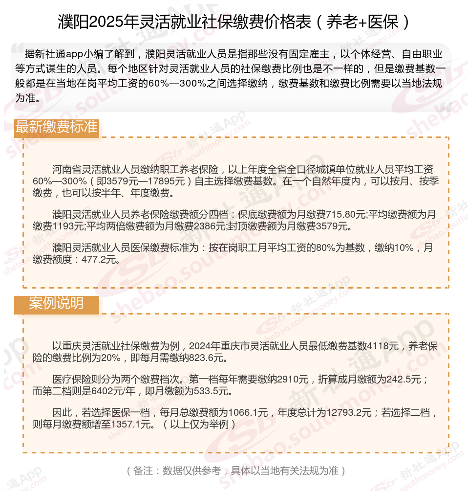 据新社通app数据显示,濮阳企业灵活就业养老保险的缴费基数为:3579元。