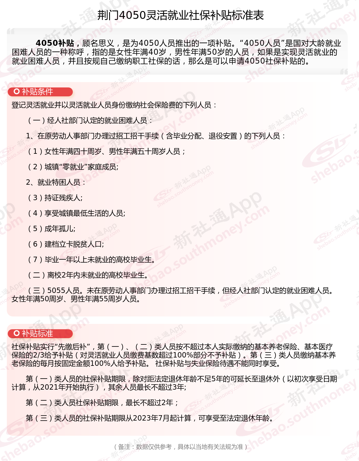 以上就是荆门4050灵活就业社保补贴的相关内容,欢迎关注新社通/下载新社通APP了解更多五险一金专业资讯。