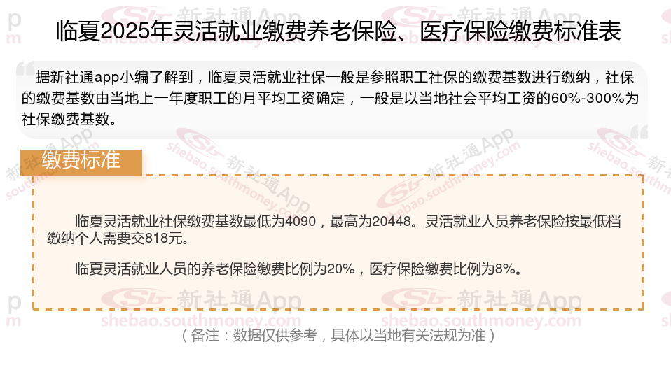 临夏灵活就业社保缴费基数最低为4090,最高为20448。灵活就业人员养老保险按最低档缴纳个人需要交818元。