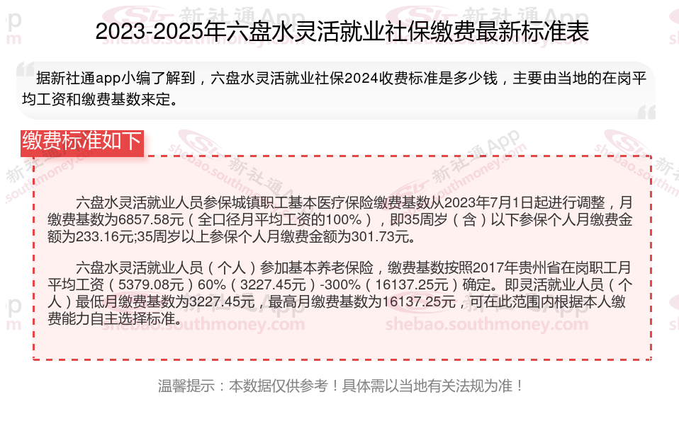 据新社通app数据显示,2024-2025年六盘水灵活就业人员养老保险的缴费标准是根据缴费基数来确定的: