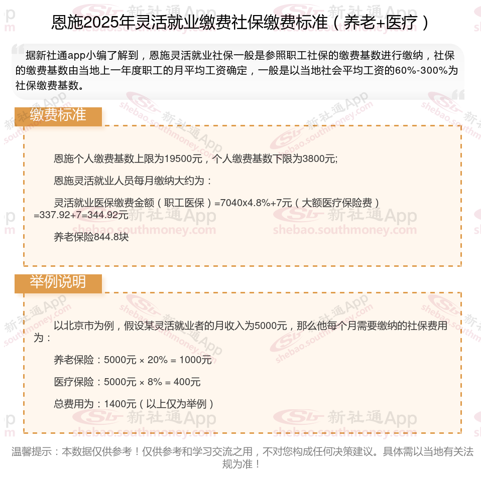 据新社通app数据显示,恩施灵活就业养老保险缴费基数2024-2025年最新标准如下: