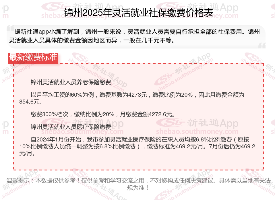 锦州灵活就业自己交社保一个月要交多少钱?灵活就业人员社保缴费按什么档次缴纳好,怎么选择划算?根据新社通app-社保缴费查询工具提供的最新数据如下: