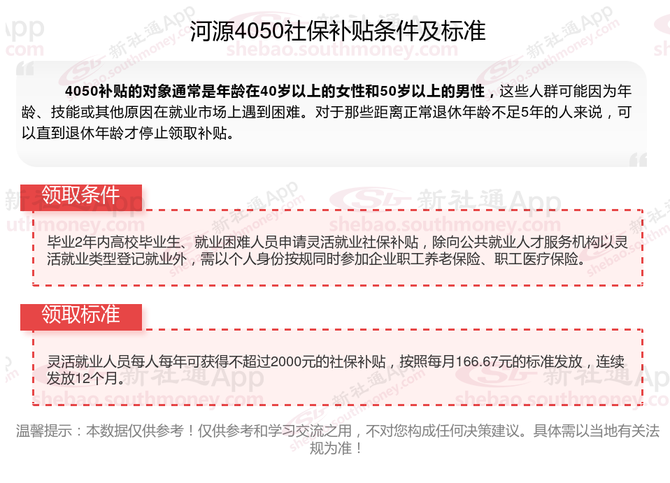 “4050人员”是国对大龄就业困难人员的一种称呼,指的是女性年满40岁,男性年满50岁的人员,那么河源4050灵活就业社保补贴标准是多少钱?河源4050社保补贴条件是什么?接下来随新社通APP小编了解一下最新资讯。