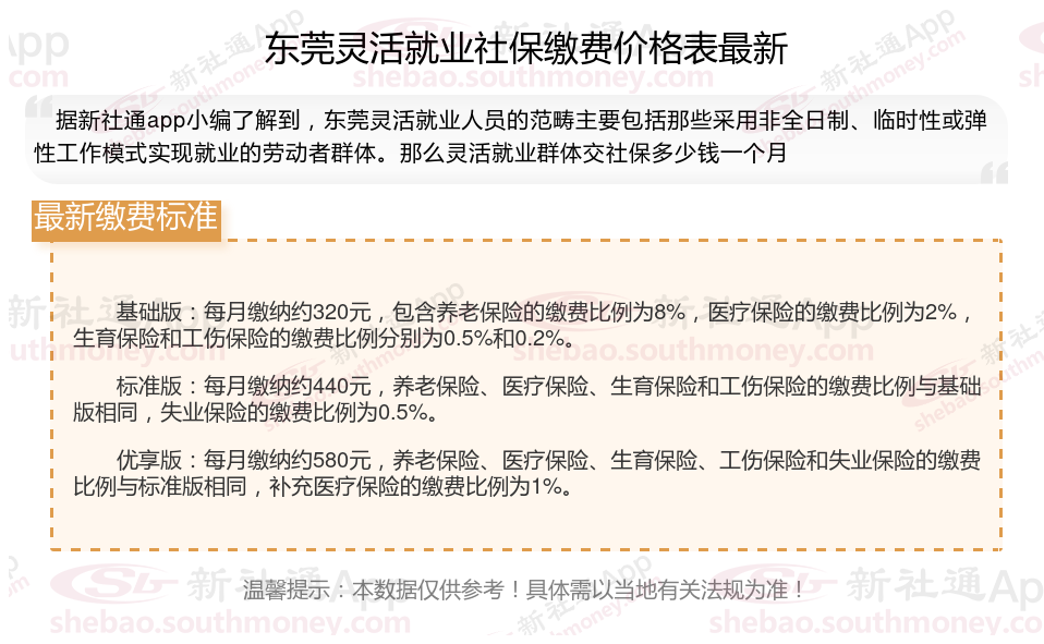 东莞灵活就业人员的社保缴费标准是多少?根据新社通app-社保缴费查询工具提供的最新数据如下: