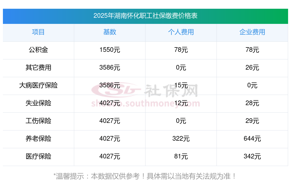 湖南怀化社保多少钱一个月?下面和新社小编一起来看看湖南怀化最低标准社保费用明细参考,新社通app-社保缴费查询工具提供的最新数据如下: