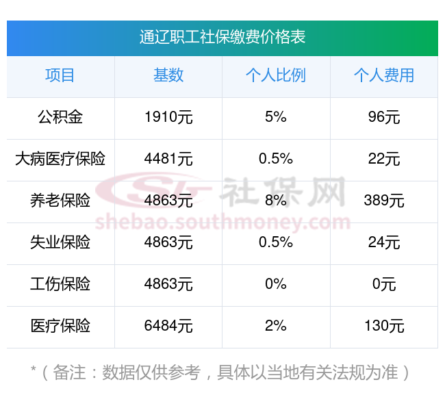 2025年通辽社保缴费最低基数及个人和单位具体是多少钱?下表是2025年通辽社保费用明细参考,新社通app-社保缴费查询工具提供的最新数据如下: