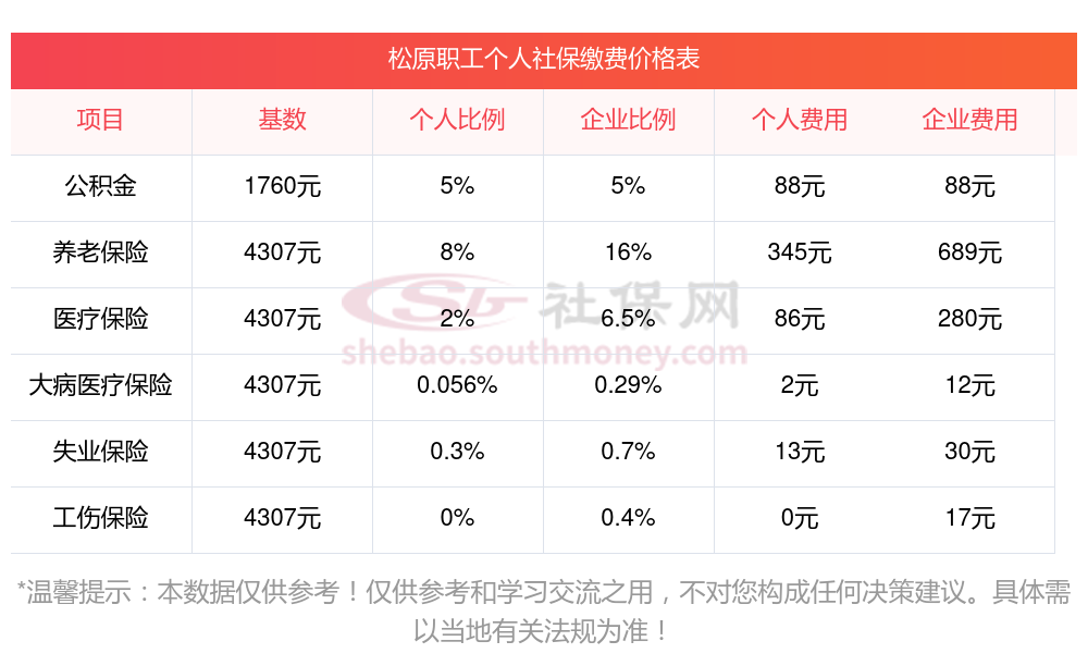 吉林社保多少钱一个月?下表是2024-2025年松原社保费用明细参考,新社通app-社保缴费查询工具提供的最新数据如下: