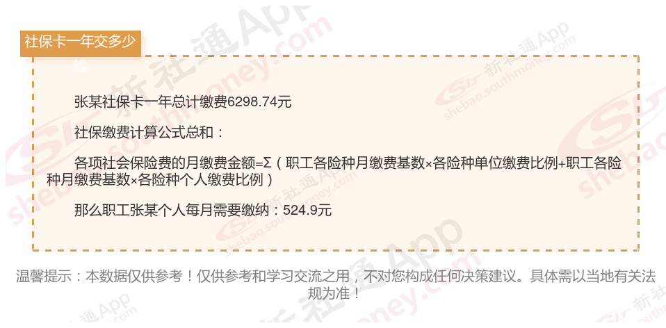 由上图得知,张某社保卡一年需要缴纳6298.74元,个人部分每月需要缴纳524.9元,若您想要了解明细点击新社通社保计算器,来了解一下明细吧。