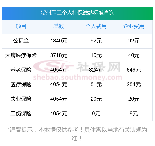 2025年贺州社保缴费最低基数及个人和单位具体是多少钱?下表是2025年贺州社保费用明细参考,新社通app-社保缴费查询工具提供的最新数据如下: