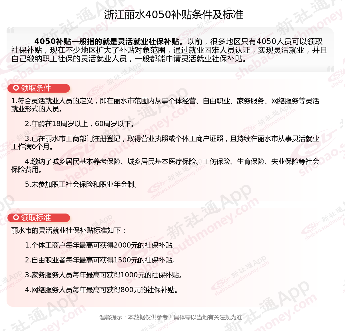 二、2025年浙江丽水4050社保补贴标准及条件,最新如下: