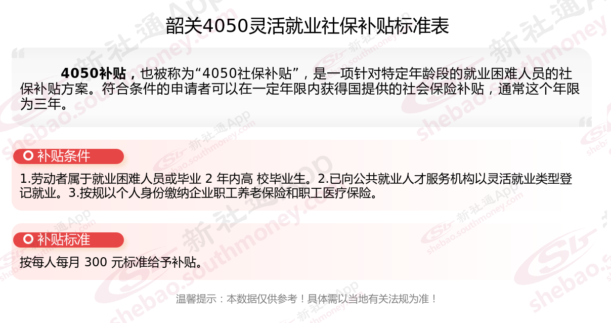 二、2025年韶关4050社保补贴标准及条件,最新如下:
