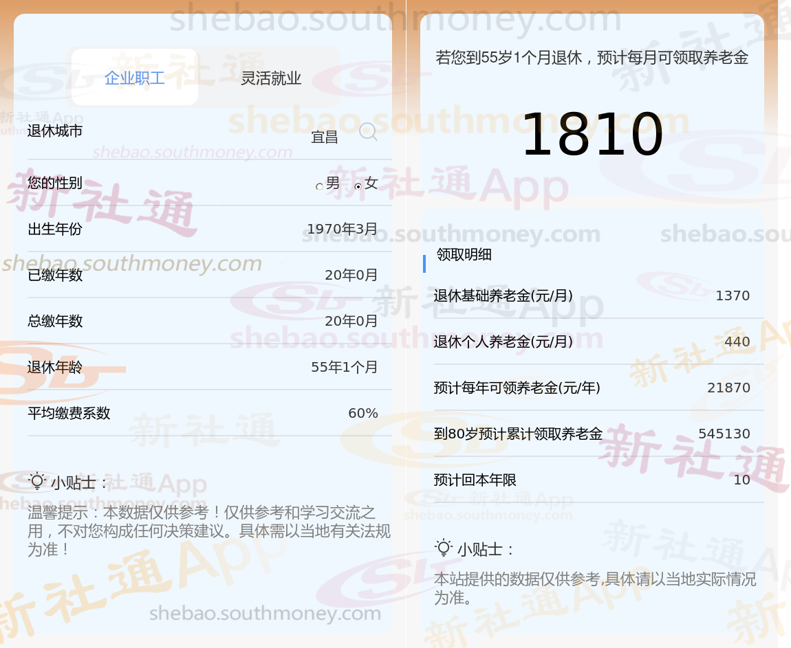 个人档案:女性,1970年出生,宜昌退休职工,社保缴费20载,档次60%。