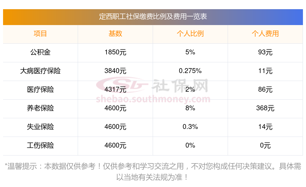 2025年定西社保缴费多少钱?下表是2024-2025年定西社保费用明细参考,新社通app-社保缴费查询工具提供的最新数据如下: