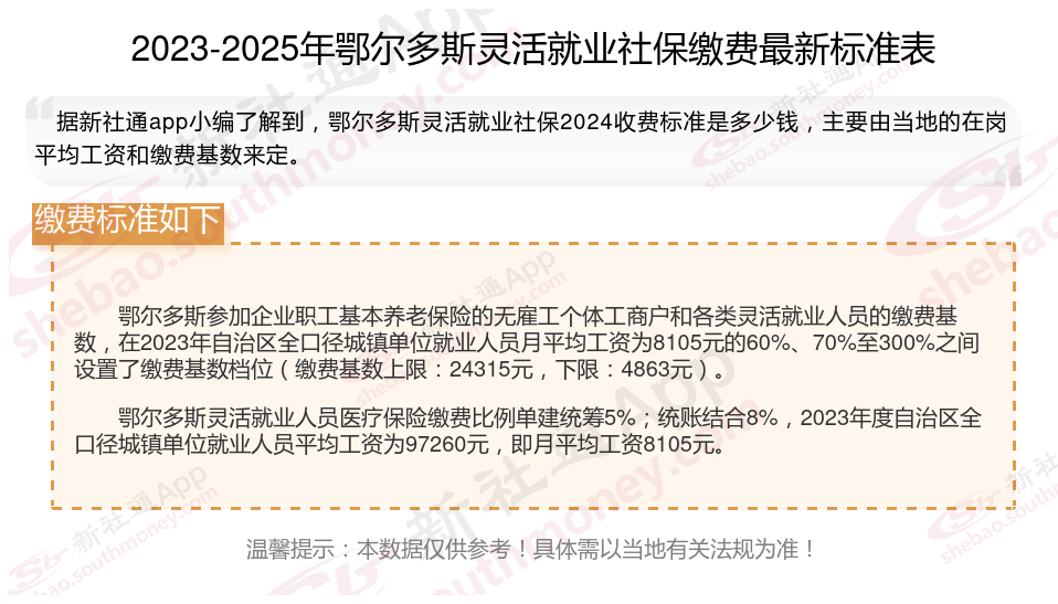 据新社通app数据显示,鄂尔多斯灵活就业人员养老缴费基数2024-2025年最新标准如下: