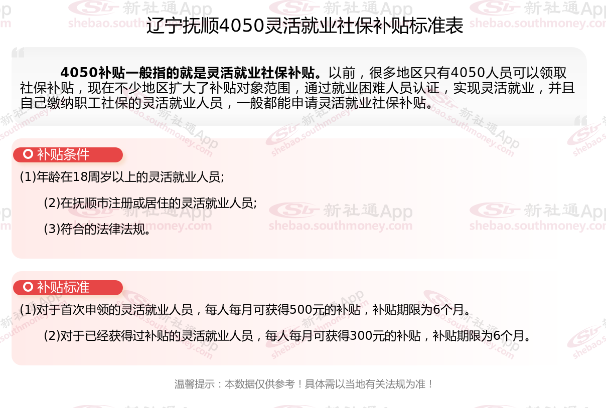 二、2025年辽宁抚顺4050社保补贴标准及条件,最新如下: