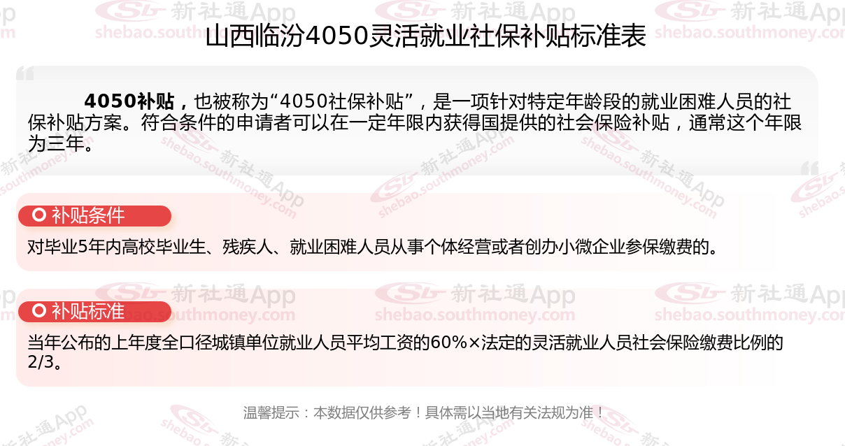 一、山西临汾4050社保补贴标准及条件2025年最新消息