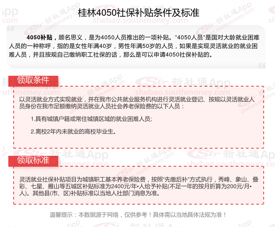 多数地区只有4050人员可以领取社保补贴,现在扩大了补贴对象及范围,通过就业困难人员认证,实现灵活就业,并且自己缴纳职工社保的灵活就业人员,一般都能申请灵活就业社保补贴。那么桂林4050灵活就业社保补贴标准是多少钱?桂林4050社保补贴条件是什么?接下来随新社通APP小编了解一下最新资讯。
