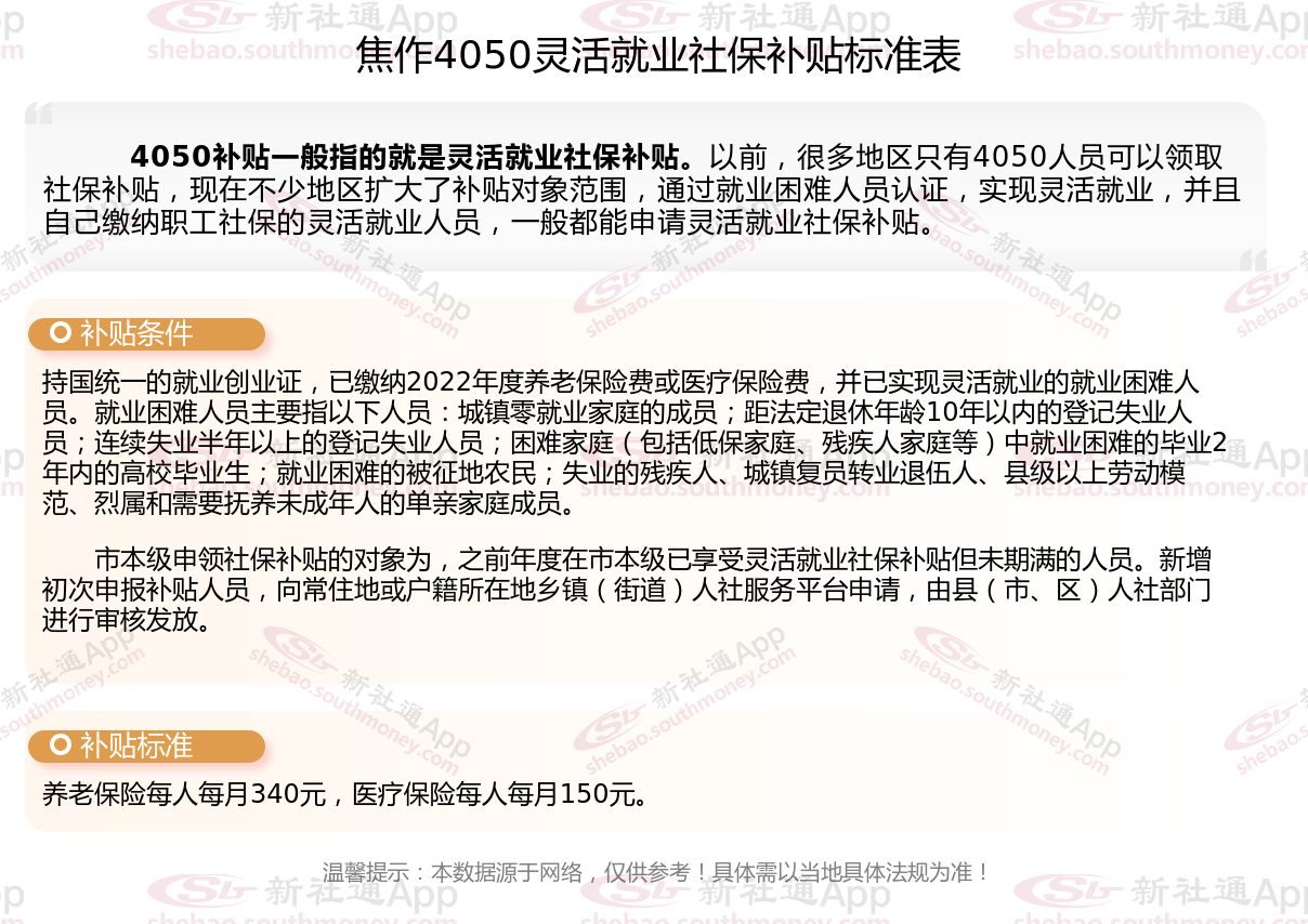今天聊一下4050补贴的相关内容。4050补贴听起来像是一个针对特定年龄人群的社保补贴。比如女性需年满40周岁,男性需年满50周岁(以申请当年12月31日为截止日期)。那么焦作4050灵活就业困难人员社保补贴多少钱?焦作4050社保补贴可以申请吗?接下来随新社通APP小编具体了解一下4050社保补贴内容。