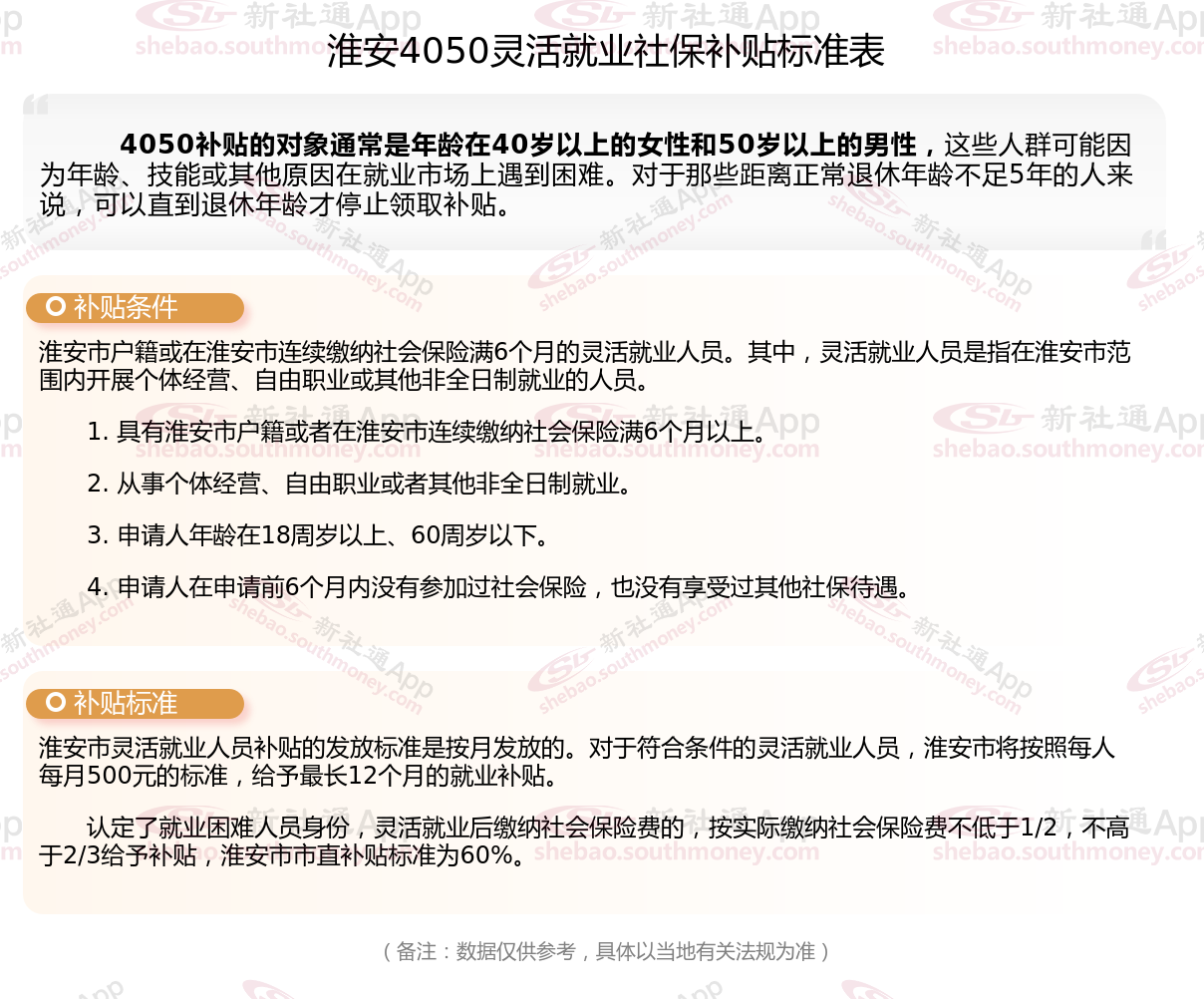 二、淮安4050社保补贴标准及条件(2025年最新)