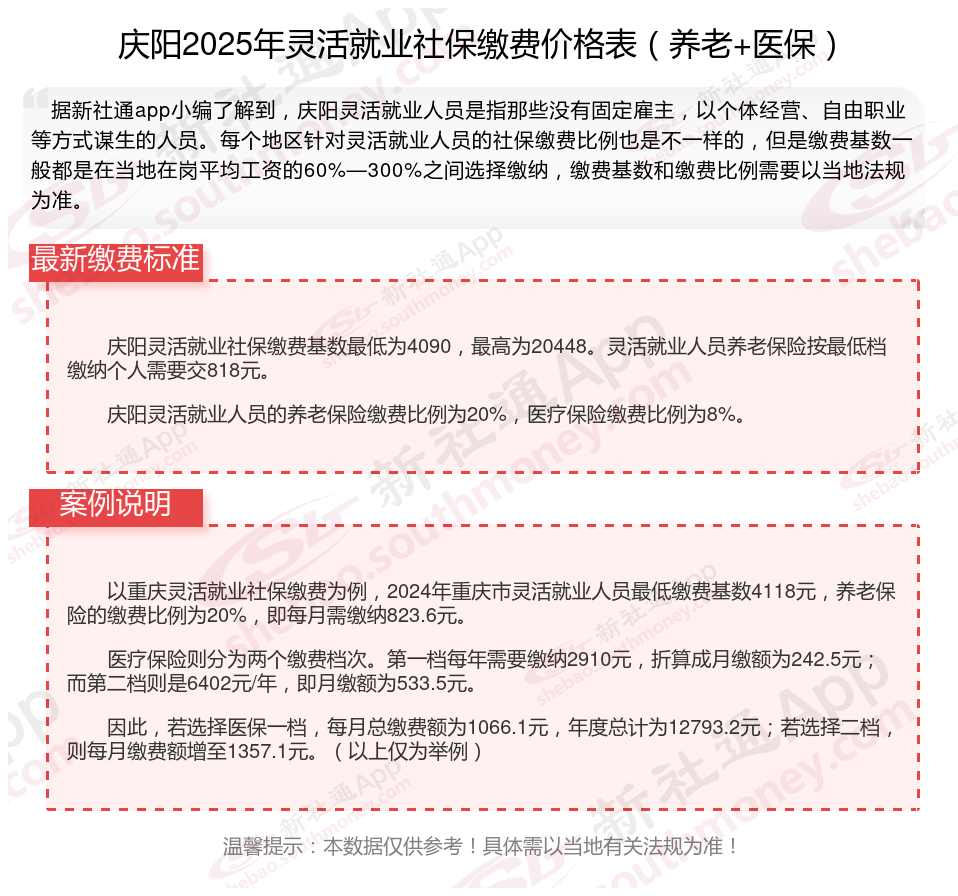 二、庆阳2024-2025年灵活就业社保缴费基数、比例最新消息