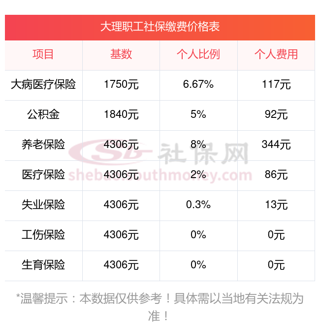 2025年大理5险缴费标准,2025年大理社保缴费多少钱?下表是2025年大理社保费用明细参考,新社通app-社保缴费查询工具提供的最新数据如下: