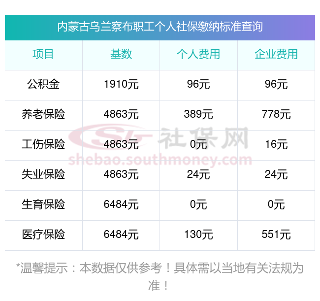 2025年内蒙古乌兰察布五险缴费标准是多少,2025年内蒙古乌兰察布社保缴费多少钱?下表是2025年内蒙古乌兰察布社保费用明细参考,新社通app-社保缴费查询工具提供的最新数据如下: