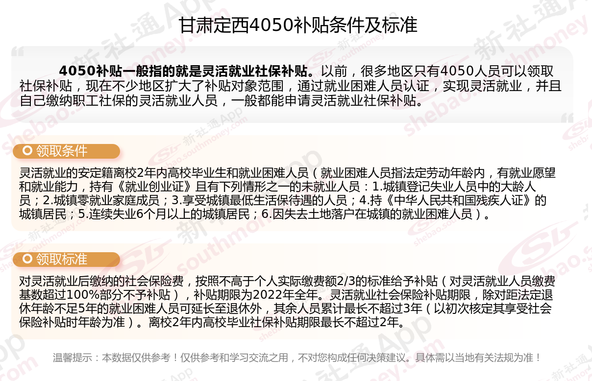 一、甘肃定西4050社保补贴标准是什么?附条件