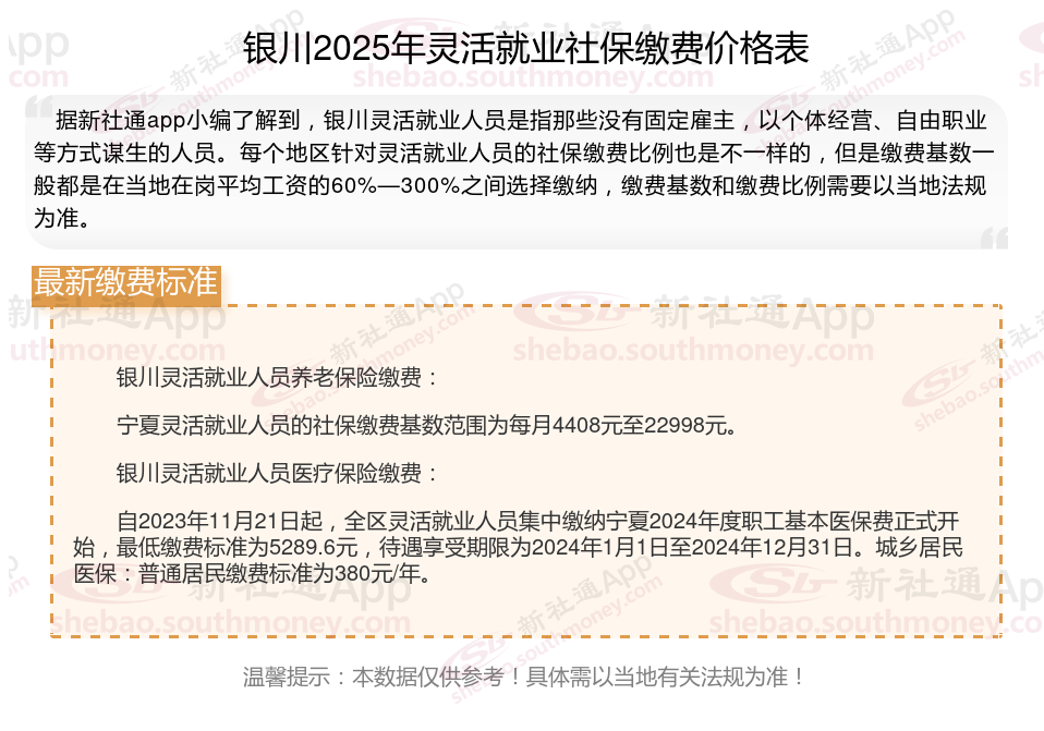 宁夏灵活就业人员的社保缴费基数范围为每月4408元至22998元。