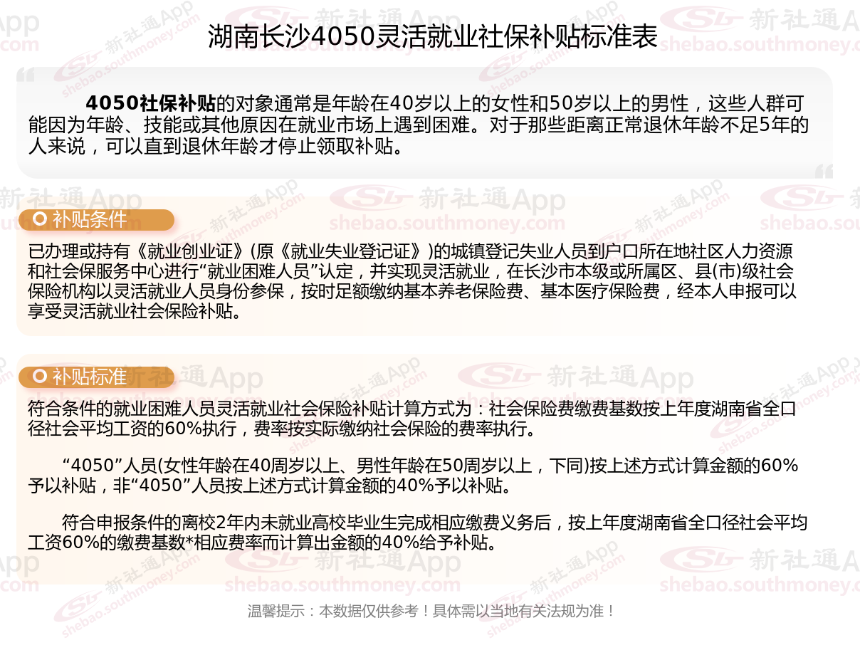 一、2023-2024年湖南长沙4050社保补贴标准及条件是多少?