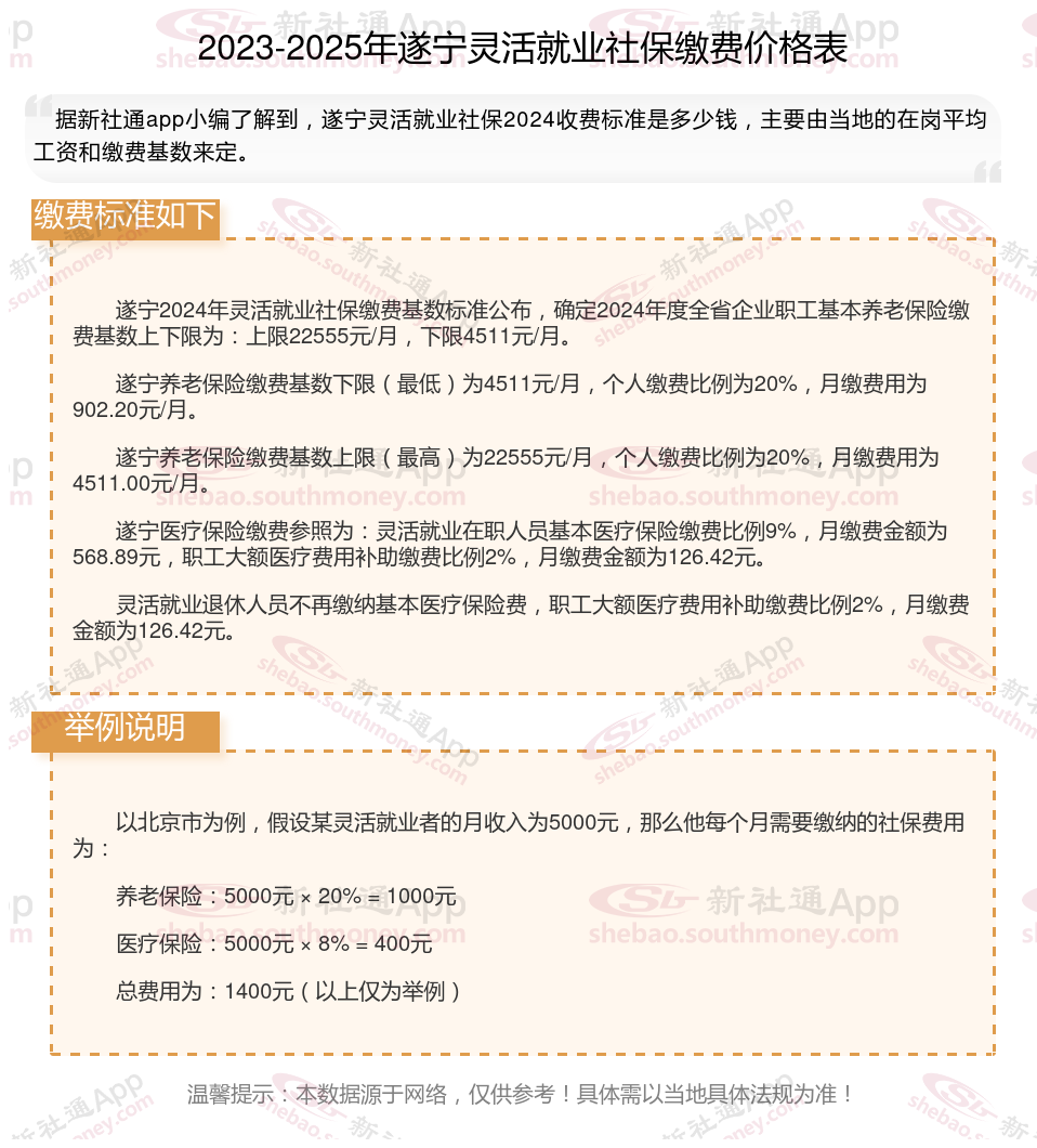 据新社通app数据显示,遂宁灵活就业养老保险缴费基数2024-2025年最新标准如下: