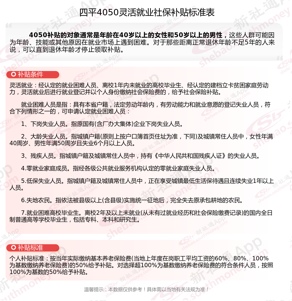 4050补贴主要是针对大龄就业困难人群的社保补贴,申请条件包括年龄、就业困难、灵活就业并自费缴纳社保,需要持有失业登记证,不同地区可能有细微差别,比如农村户口的限制。那么四平4050灵活就业社保补贴标准是多少钱?四平4050社保补贴条件是什么?接下来随新社通APP小编了解一下最新资讯。