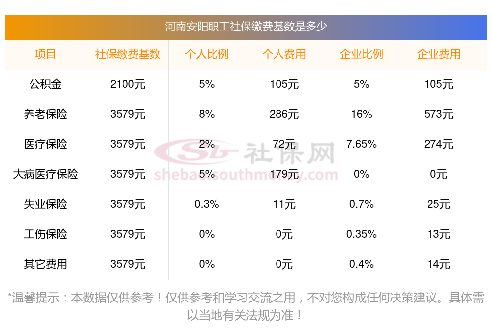 河南安阳2025年社保养老保险缴费标准是多少?下表是2025年河南安阳社保费用明细参考,新社通app-社保缴费查询工具提供的最新数据如下: