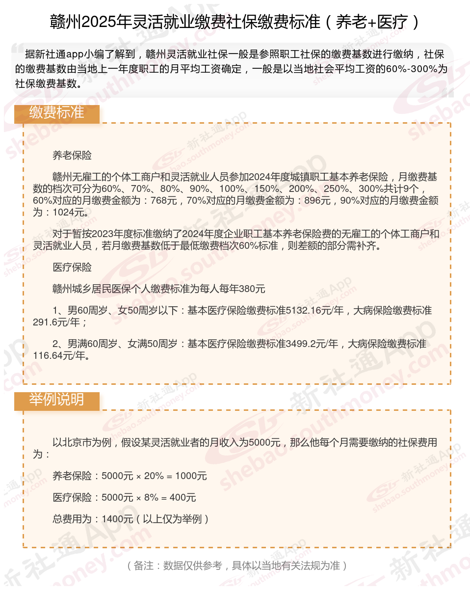 据新社通app数据显示,2024-2025年赣州灵活就业人员养老保险的缴费标准是根据缴费基数来确定的: