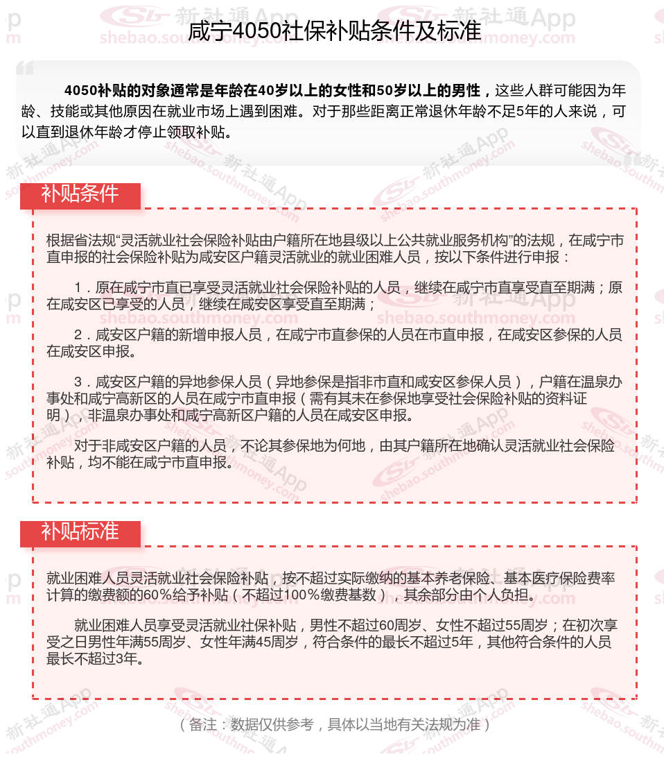 二、2025年咸宁4050社保补贴标准(咸宁4050灵活就业人员补贴标准是多少钱?咸宁2025年4050补贴新规能领多少钱?)