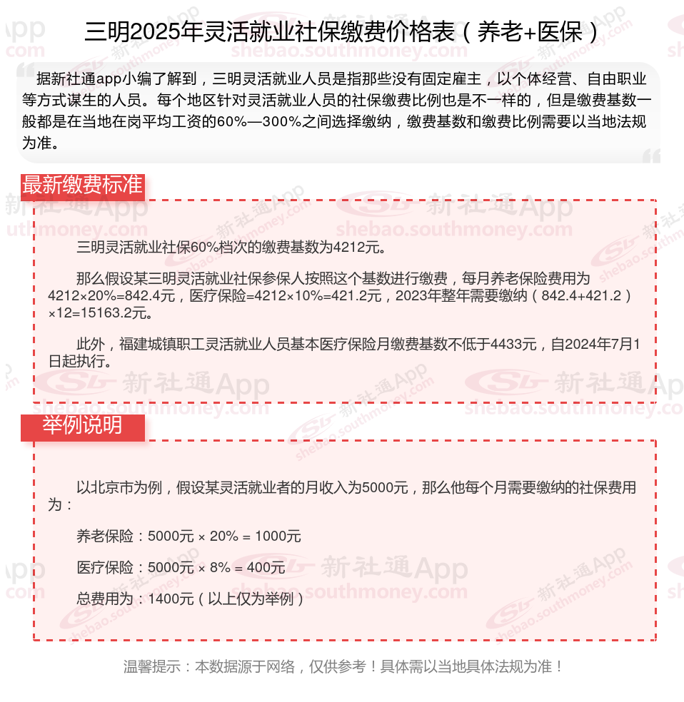2025年三明灵活就业缴费标准个人交多少呢, 个人是可以自己交社保的吗?根据新社通app-社保缴费查询工具提供的最新数据如下: