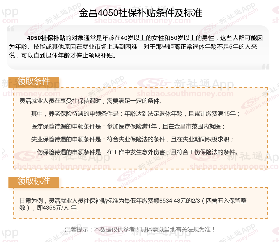 二、2025年金昌4050社保补贴标准及条件,最新如下: