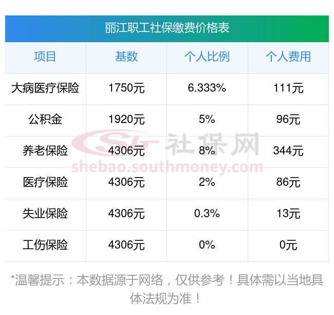 2025年丽江五险缴费标准是多少,2025年丽江社保缴费多少钱?下表是2025年丽江社保费用明细参考,新社通app-社保缴费查询工具提供的最新数据如下: