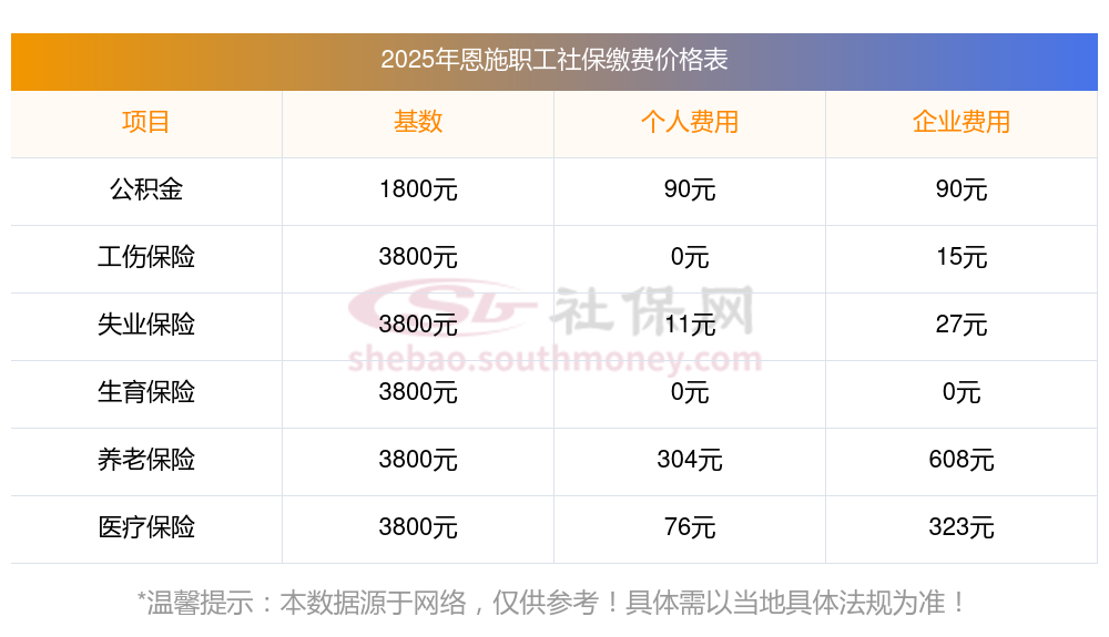 2025年恩施社保缴费多少钱?下表是2024-2025年恩施社保费用明细参考,新社通app-社保缴费查询工具提供的最新数据如下: