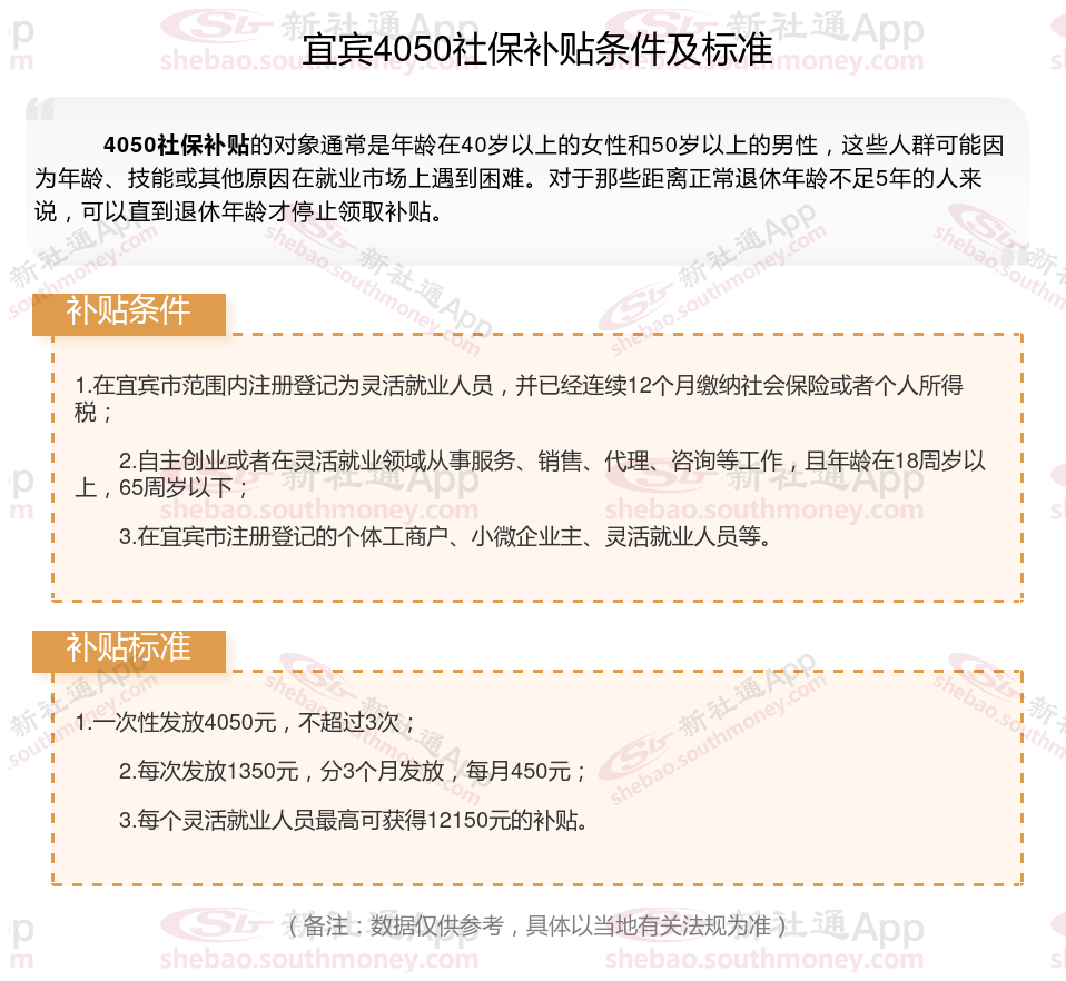 二、2025年宜宾4050社保补贴标准及条件,最新如下: