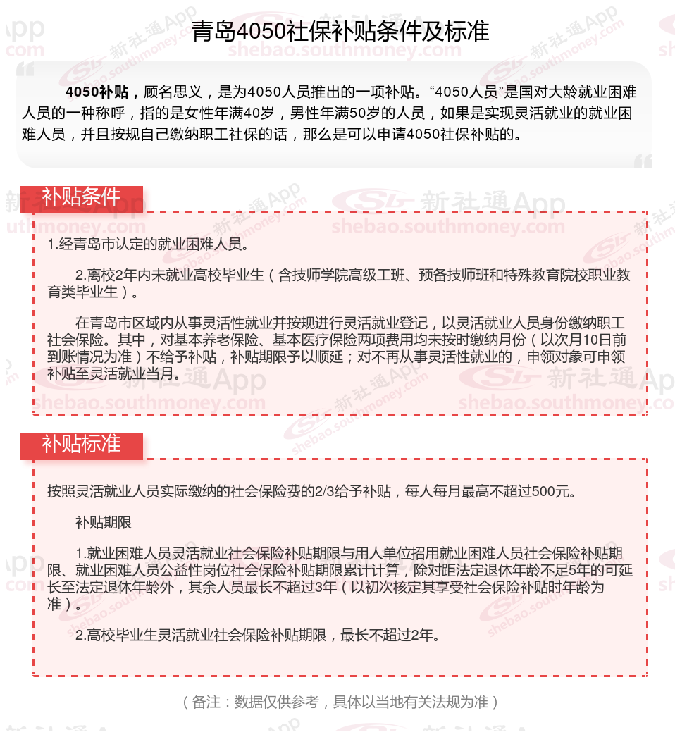今天聊一下4050补贴的相关内容。4050补贴听起来像是一个针对特定年龄人群的社保补贴。比如女性需年满40周岁,男性需年满50周岁(以申请当年12月31日为截止日期)。那么青岛4050灵活就业困难人员社保补贴多少钱?青岛4050社保补贴可以申请吗?接下来随新社通APP小编具体了解一下4050社保补贴内容。