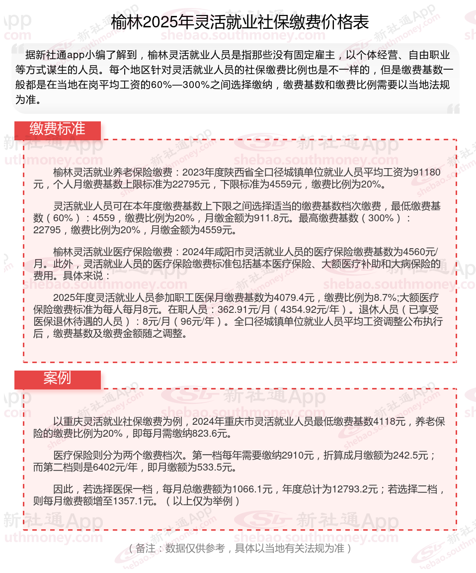 据新社通app数据显示,榆林灵活就业养老保险的缴费基数为:4559元。灵活就业人员参保缴费的比例为个人20%。