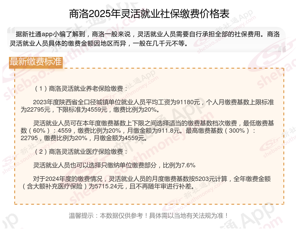 据新社通app数据显示,商洛灵活就业人员养老缴费基数2024-2025年最新标准如下: