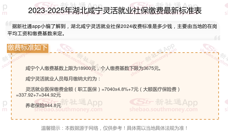 以上就是带来湖北咸宁灵活就业社保缴费标准相关知识,内容供参考,希望对你有帮助,欢迎关注/下载新社通APP解锁更多社保专业资讯。