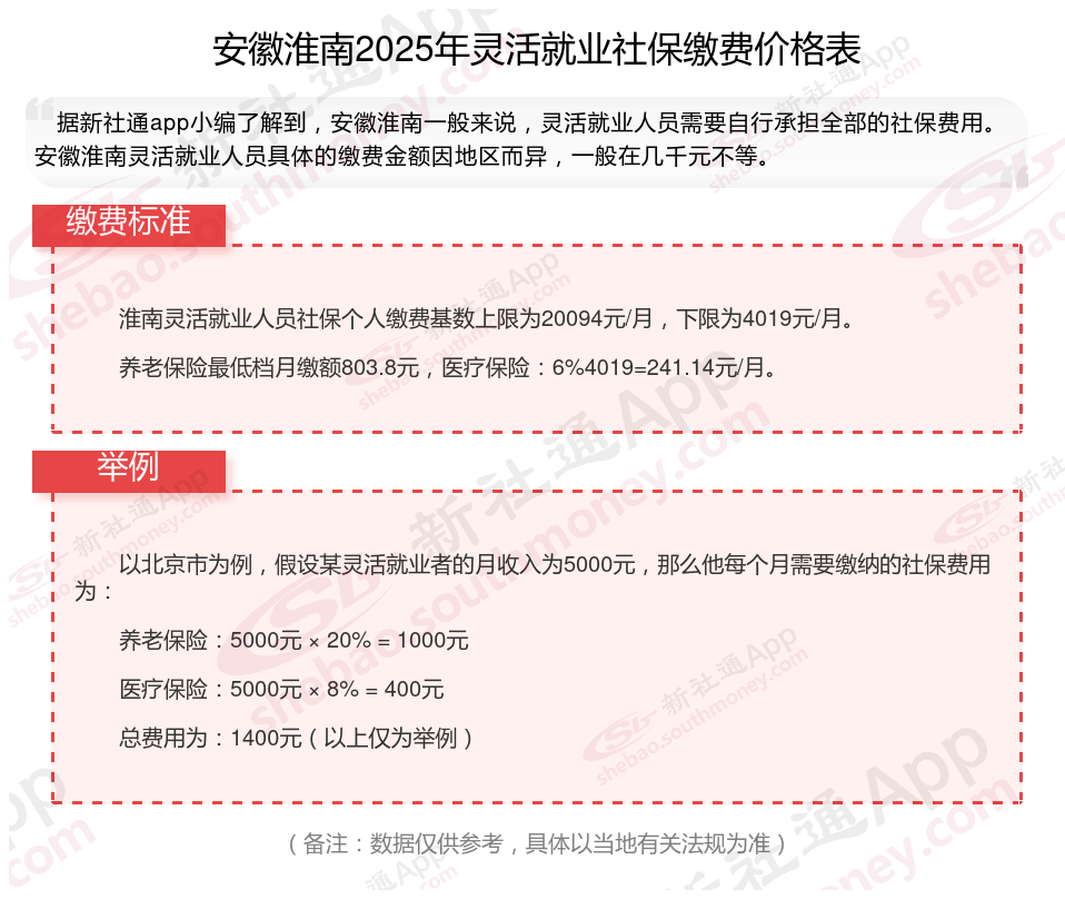安徽淮南灵活就业社保缴费标准来了 灵活就业社保最低要交多少钱?根据新社通app-社保缴费查询工具提供的最新数据如下: